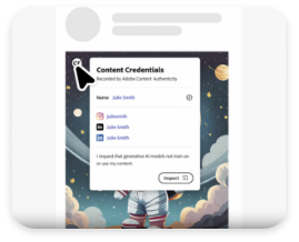 Adobe Content Authenticity puts credibility back in creators’ hands. It allows you to attach verifiable metadata to your visuals so everyone can see who made them, how they were created, and where they came from.