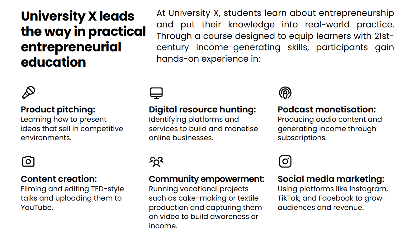 The result is a graduate who leaves campus not only with a degree, but also with the confidence, portfolio, and entrepreneurial toolkit to start creating value immediately.