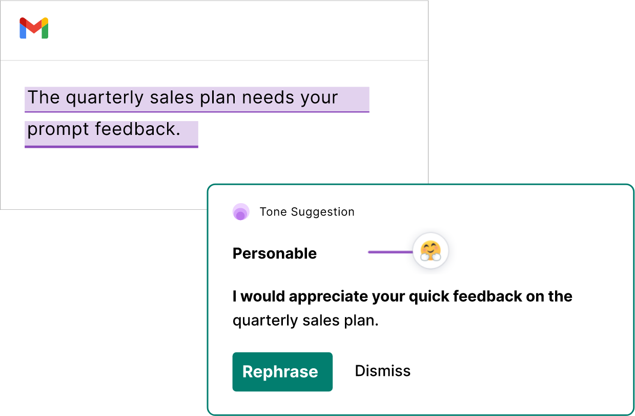 Seamlessly analyses tone and prompts the user to adjust messaging appropriately. Improves communication outcomes.